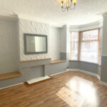 Laminate floor, skirting boards, painted walls, decorative fireplace, wall mounted mirror, wall mounted radiator, double glazed window with fitted blinds, coving and central ceiling light point.