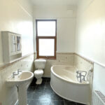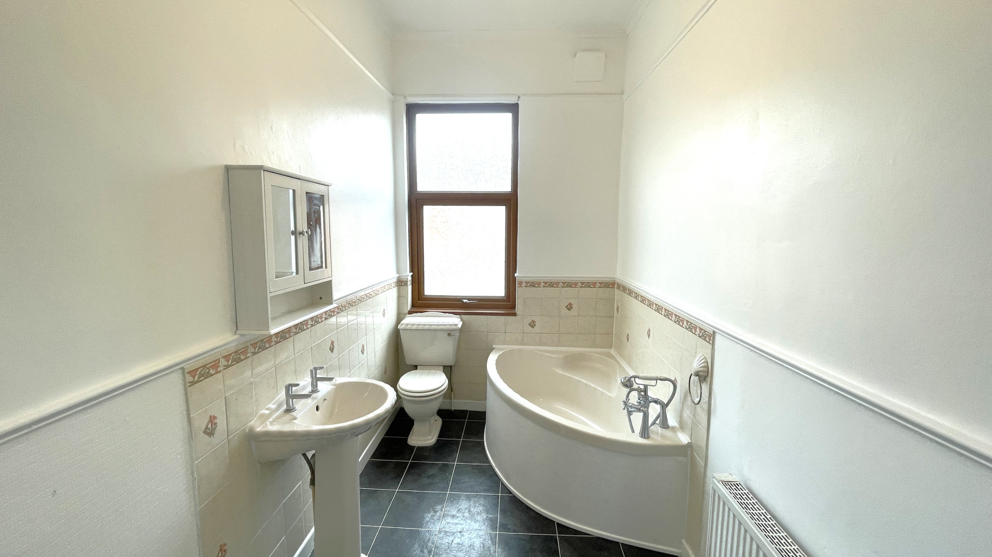 Vinyl floor, skirting boards, partially tiled & painted walls, wall mounted radiator, low level W/C, wash hand basin, bath with shower attachment, wall mounted cupboard with mirror, central ceiling light point and double glazed window.