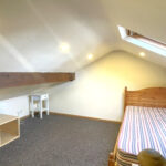 Carpeted floor, skirting boards, painted walls, spotlights, wall mounted electric heater and skylight.